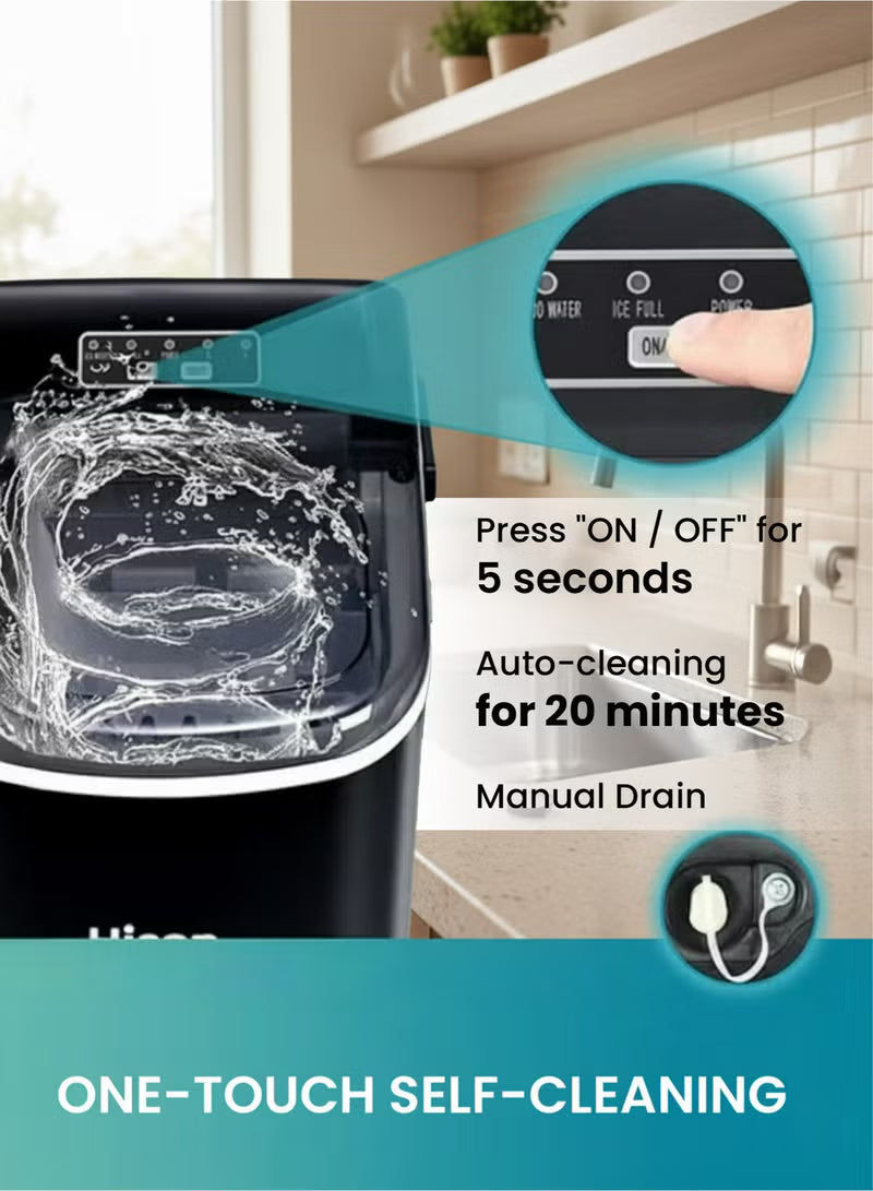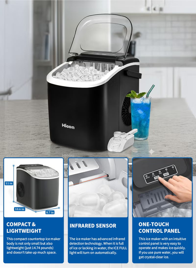 • User Friendly & Simple Operation: Hicon ice maker adopts large see-through window visualized design, allowing viewing of the interior ice-making. Equipped with a 170w upgraded compressor that 4kWh/24H energy consumption to save your electricity bills. And with a easy-to-operate controlable panel for faster operation in just two steps, adding water and press "ON/OFF". Then our ice maker will provide you fresh bullet ice for you and your member timely.