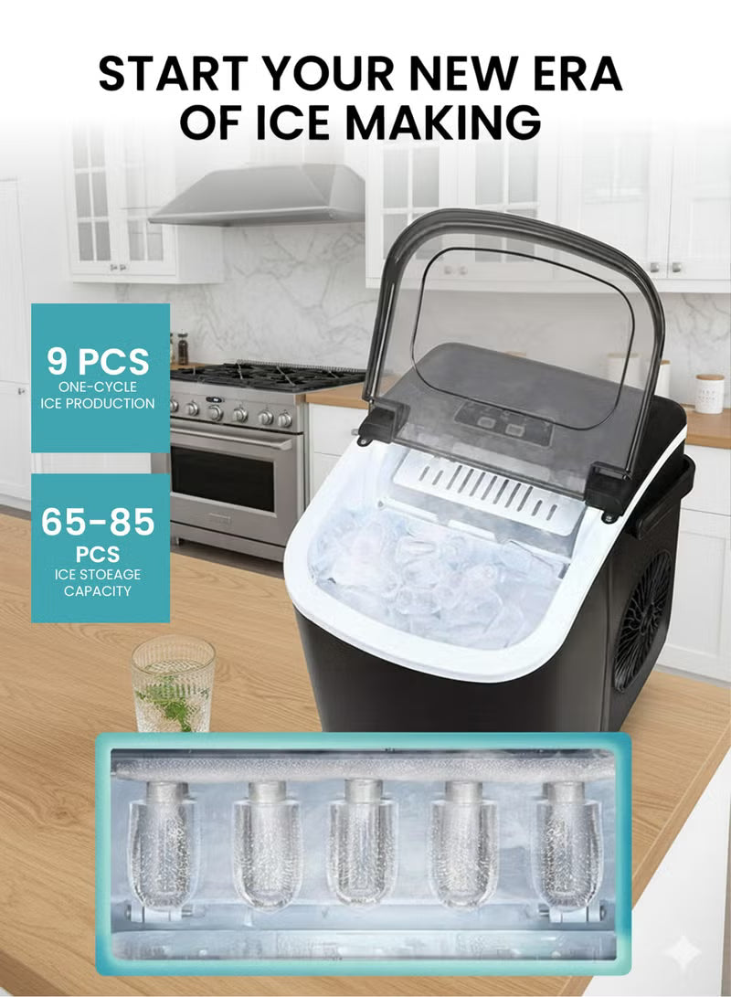 • Portable Design & Perfect Bullet Ice: Our ice maker comes with a sturdy handle, weighs only 13.89lbs and with compact size 11.57(L)*11.42(W)*8.74(H)in. Those features make ice maker easy to carry and perform well on any occasions like Kitchen/Home/Camping/RV. Also, the newly designed countertop ice maker produce the most popular bullet-shaped smooth ice cubes, which won't stick together easily or hurt your hands or mouth even are perfect for cold drinks or iced coffee.