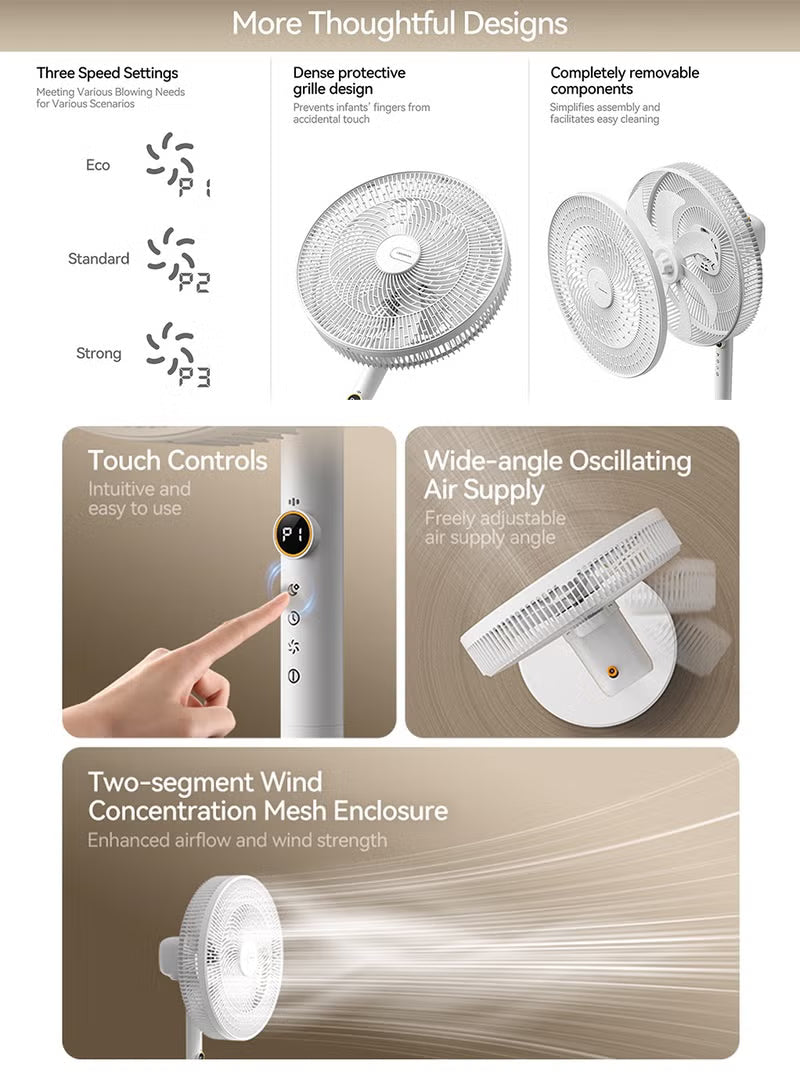 The wide-angle oscillation ensures that air reaches every corner of the room, providing consistent and even cooling. Whether you're working, sleeping, or relaxing, the fan adjusts to your needs with three selectable speed levels, easily controlled through the intuitive touch-sensitive interface. This modern control panel offers a seamless and user-friendly experience, with no physical buttons to press.