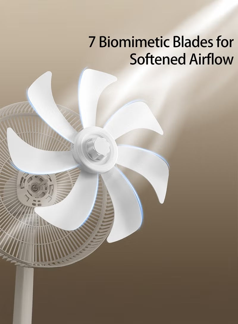 At the heart of the fan is a set of biomimetic blades, inspired by the natural aerodynamics of bird wings. These uniquely shaped blades produce a smoother and quieter breeze while maximizing airflow efficiency. Combined with the two-segment wind concentration mesh enclosure, the fan focuses and amplifies the breeze, delivering enhanced wind strength and circulation that outperforms traditional blade designs.