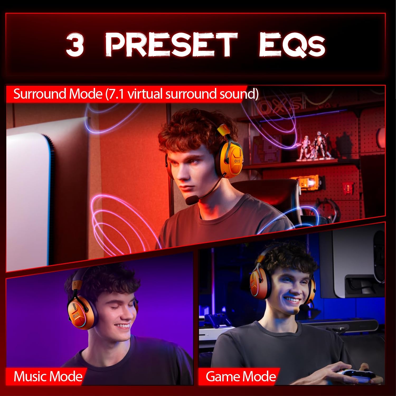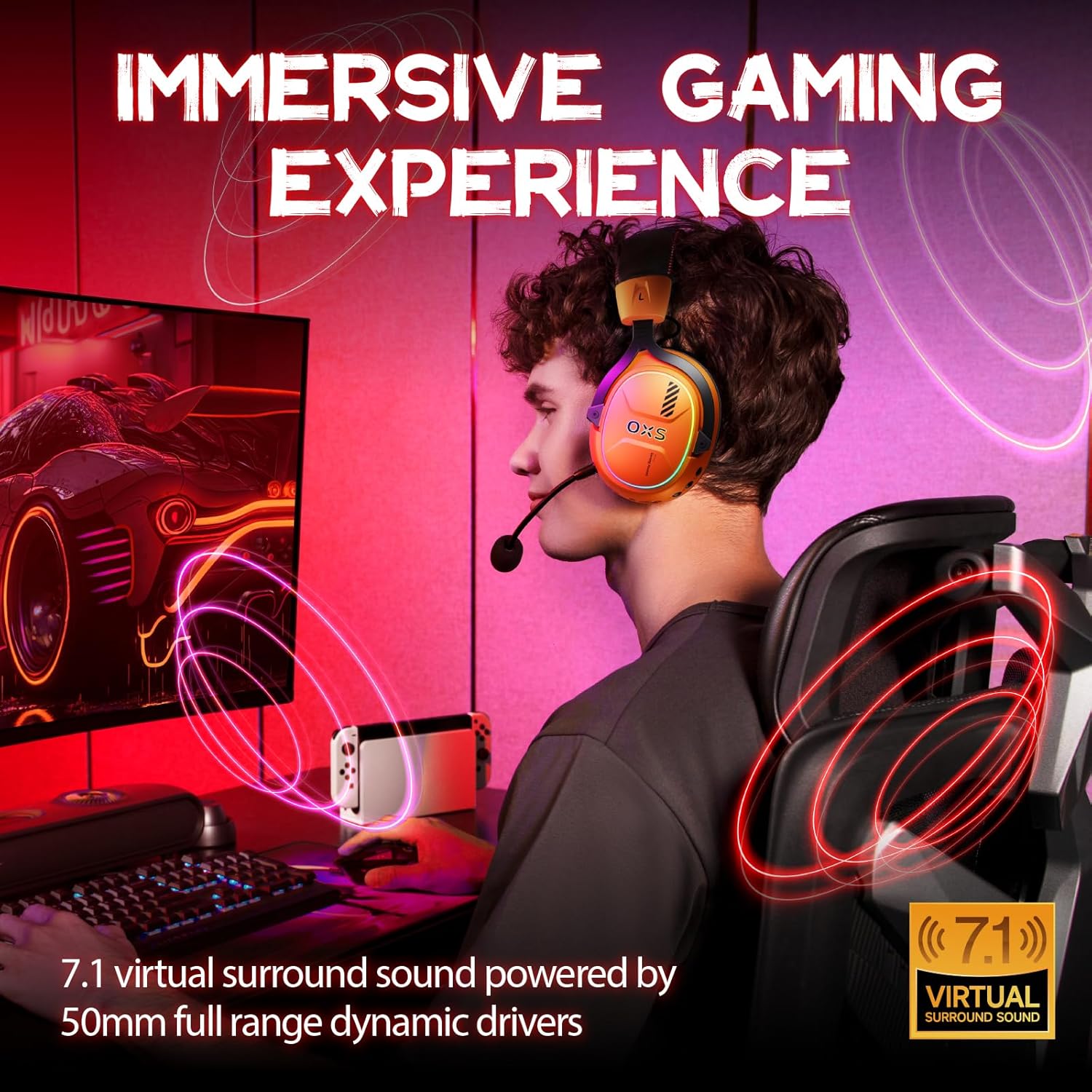 OXS Wireless Gaming Headset, Gaming Headphones with 7.1 Surround Sound & 70Hrs+, 2.4GHz/Wireless/Bluetooth, Over-ear Headphones with USB Type-C and RGB for PC, PS4, PS5, Switch, Laptop, Phone (Orange)